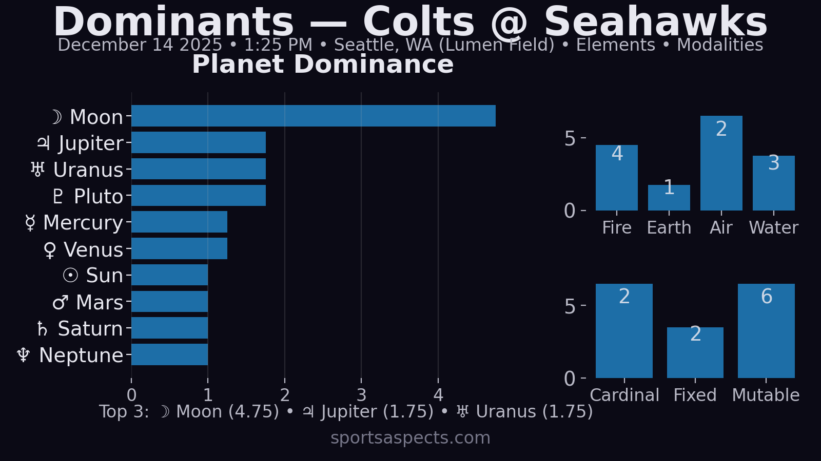 - Moon on the Descendant = Colts narrative on top. Indy leading fits the chart’s loudest angular cue (Moon conjunct DSC): visitor momentum tends to arrive first and keep the spotlight on the Colts’ side.