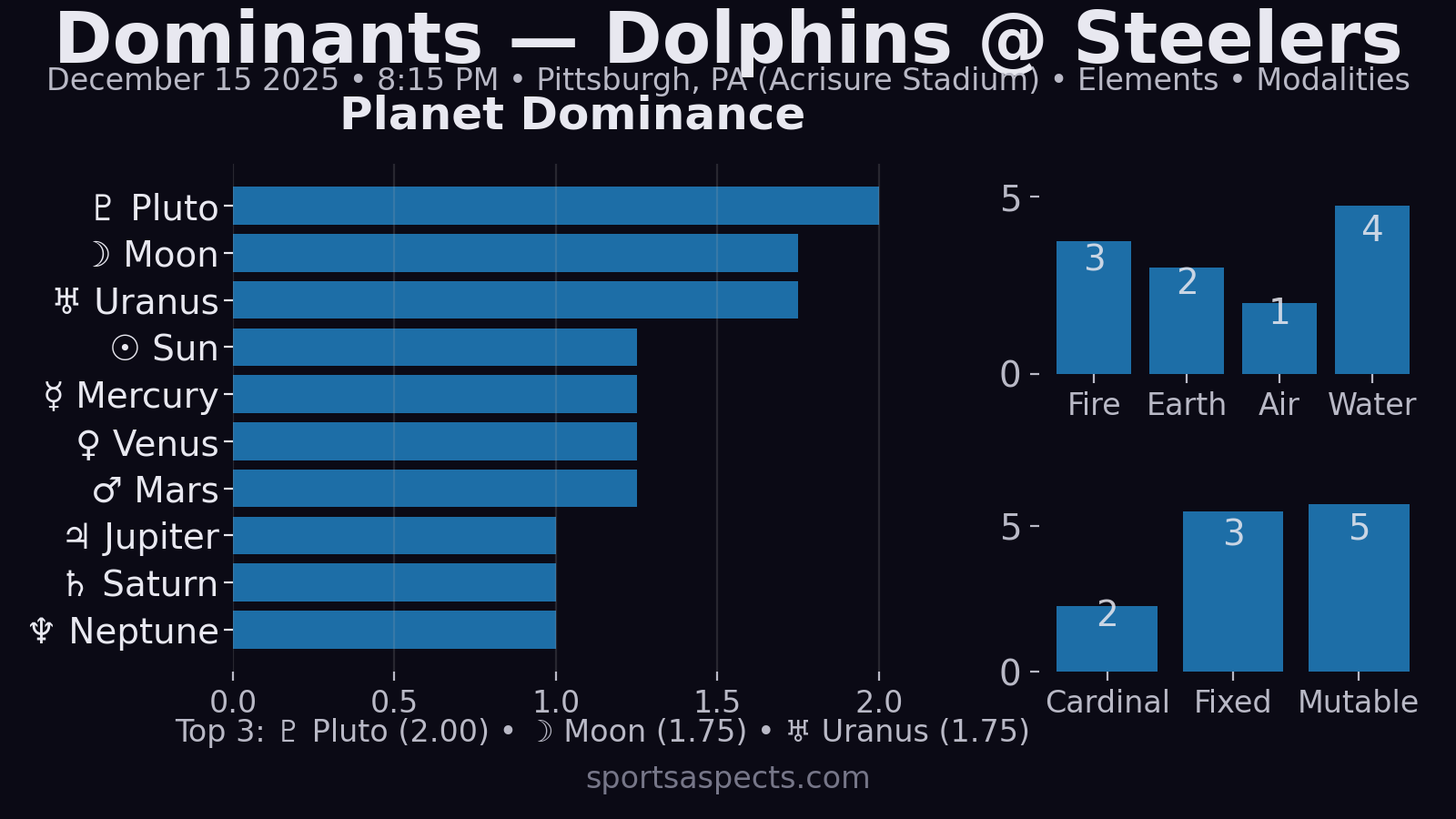 With Leo rising, this kickoff chart puts the Steelers on a Sun-ruled stage—and the Sun is loud in the 5th house of sport alongside a Sagittarius surge, screaming “big moments,” especially with Vertex tightly on the Sun. But that spotlight comes with a price: the Sun is squared by Saturn and Neptune, a classic signature for a game where execution gets messy—timing issues, flags, and drives that look promising before stalling in confusion. Meanwhile, the Dolphins ride a disruptive edge with Pluto sitting on their Descendant, the kind of placement that can turn a single sack, takeaway, or fourth-down stand into a momentum flip. Add a Scorpio Moon in the 4th squaring that Pluto and you’ve got a high-emotion, high-pressure atmosphere: fewer “smooth” stretches, more swings—where composure and discipline decide who cashes the highlight energy and who gets swallowed by the fog.