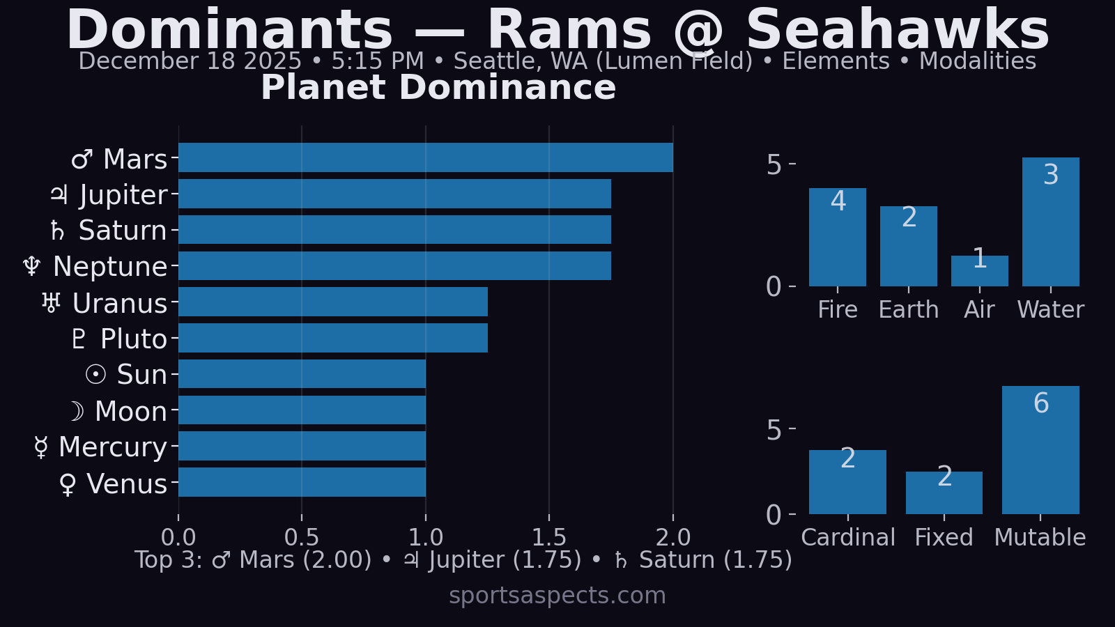 Last night’s TNF Rams @ Seahawks played out like a textbook Saturn–Neptune (10th house) script: structure constantly fighting fog, with big moments warped by flags, reversals, and sudden momentum flips. The chart’s heavy 6th-house Sagittarius stack (Sun/Moon/Mercury/Venus/Mars) showed up as a grind of execution and “little things” deciding everything — most loudly when the Rams had a TD wiped out at 1:49 (1Q) and settled for a short FG at 1:43, then again with the late-game penalty swings and stalled possessions. The Neptune-dominant feel was all over the chaos: replay drama, the near “interception” in OT that got overturned into an incompletion, and the overall nothing stays clean for long vibe — even Seattle’s late push had the surreal signature of a punt-return TD at 8:03 (4Q) to yank them back into it, followed by the late tie and a Rams missed FG at 2:11 (4Q) that felt like Neptune’s “wide right / what if” moment. Meanwhile Jupiter + Fortune in Cancer in the 1st (home side juice) kept showing Seattle a lane back into the game, from the early 7:09 (1Q) TD through the explosive Walker 55-yard TD at 12:57 (3Q), and finally the fated finish: with the MC on the Node, the night demanded a headline ending — Rams strike first in OT (6:27), but Seattle answers and lands the dagger with the walk-off TD at 3:13 (OT) plus the conversion to win 38–37.