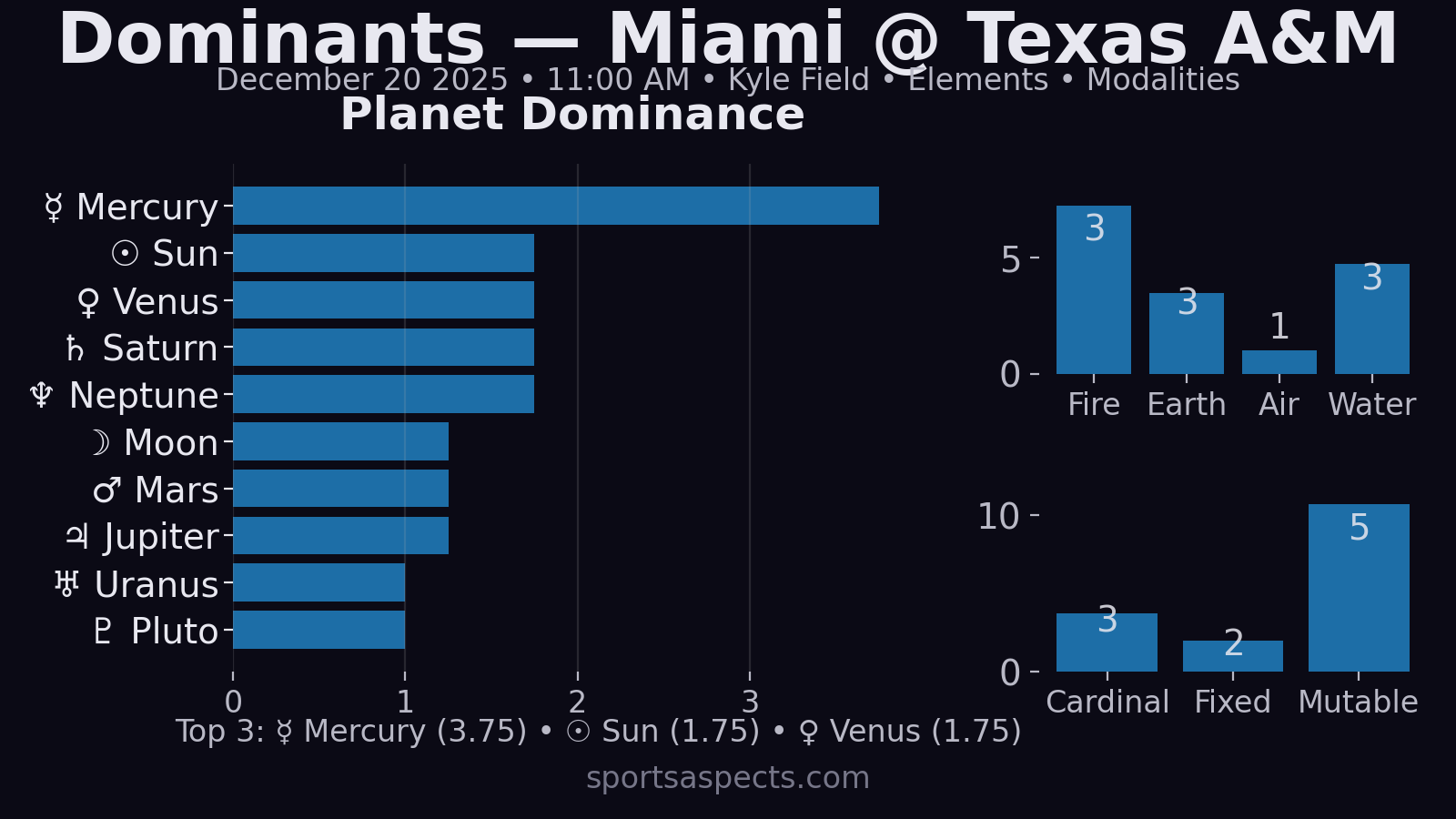 - 1st house loaded (Saturn/Neptune/Node/Fortune in Pisces): home-field “identity” is huge — but it’s a Pisces 1st: emotion + atmosphere + nerves. If the Aggies steady the ship, they can own the tone; if they get sloppy, this chart punishes fast.