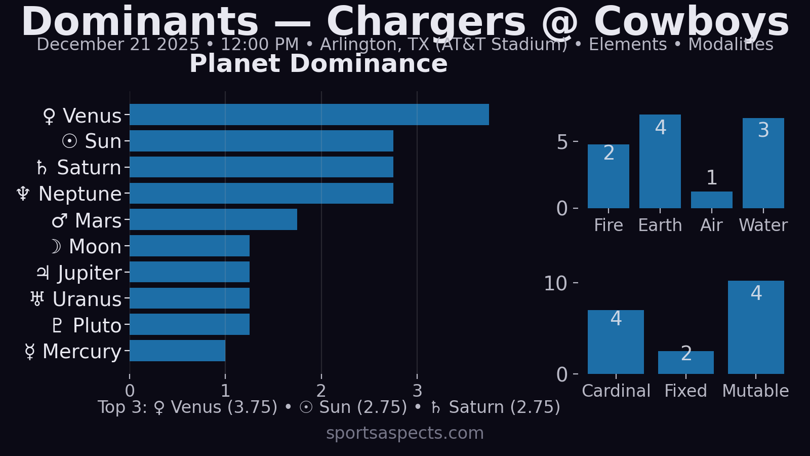 - Notably, Mercury isn’t tied into your listed major aspects, so the Chargers’ “execution / decision layer” can feel hit-or-miss compared to the Cowboys’ ruler being heavily networked.