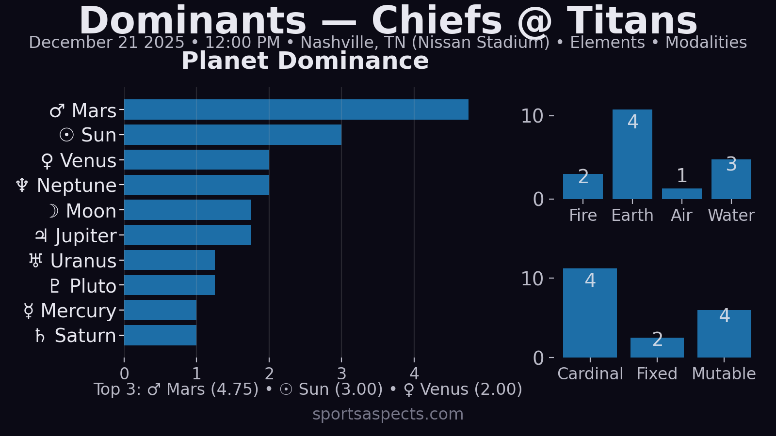 Aries rising sets an aggressive, punch-first tone in Nashville, but the real headline is Mars in Capricorn sitting on the Midheaven, with the Sun newly in Capricorn nearby—this kickoff chart screams execution, physical control, and coaching-grade football. The Moon in Capricorn in the 10th adds scoreboard pressure: composure and situational discipline decide who cashes in. Still, the chart has a built-in “weirdness tax” with Sun square Neptune (plus Saturn/Neptune building in the 12th) and Venus square Saturn/Neptune, a signature for miscommunications, stalled red-zone possessions, or a special-teams/penalty sequence that flips momentum. With Moon opposing retro Jupiter in Cancer, expect the crowd/emotion factor to surge in waves—this can look like a grind… until it suddenly isn’t.