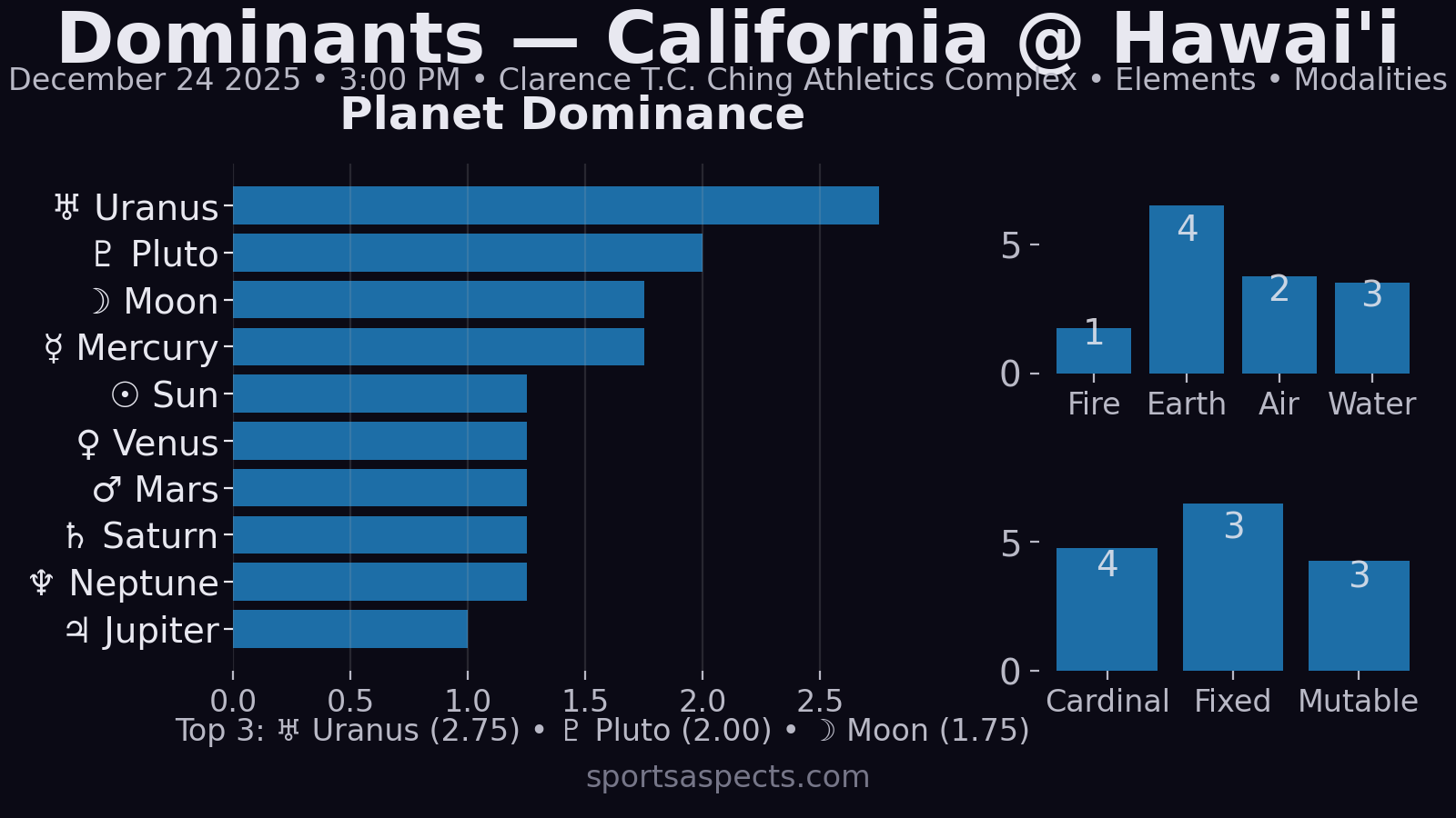 Simple read: Hawai’i’s ruler (Venus) is the steering wheel, but it’s under fog/pressure; California’s ruler (Mars) is powerful and direct. If Hawai’i keeps it clean, they can ride the Moon–Venus lift. If Hawai’i gets sloppy, California’s Mars can punish mistakes hard.