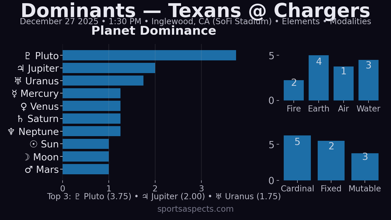 Chargers can win this by being the more mature team in chaos — but they cannot be sloppy with the ball. - Venus is tightly tied into the engine room: Sun conjunct Venus, Sun conjunct Mars, Venus conjunct Mars