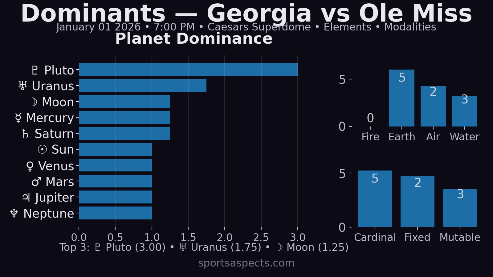 - Spread: chart gives Ole Miss legitimate cover/upset signatures (Pluto on DSC + volatility markers), even if Georgia is the “strong structure” side.