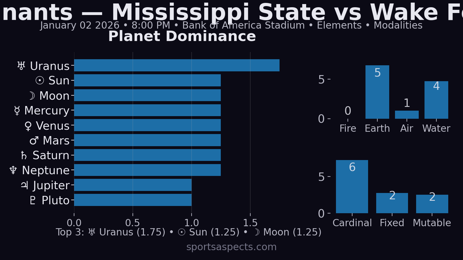 If we’re using the favorite-as-ASC convention for a neutral bowl: Mississippi State = ASC (-3 / -155), Wake Forest = DSC (+3 / +130). With that mapping, ASC gets the Capricorn stellium “engine,” but it’s under constant pressure from the Cancer Moon opposition: Mississippi State can look in control and still have the game stay annoyingly close. This is the kind of chart where you can feel like one side is “better” and yet it stays inside a single-score band because the game keeps producing friction.
