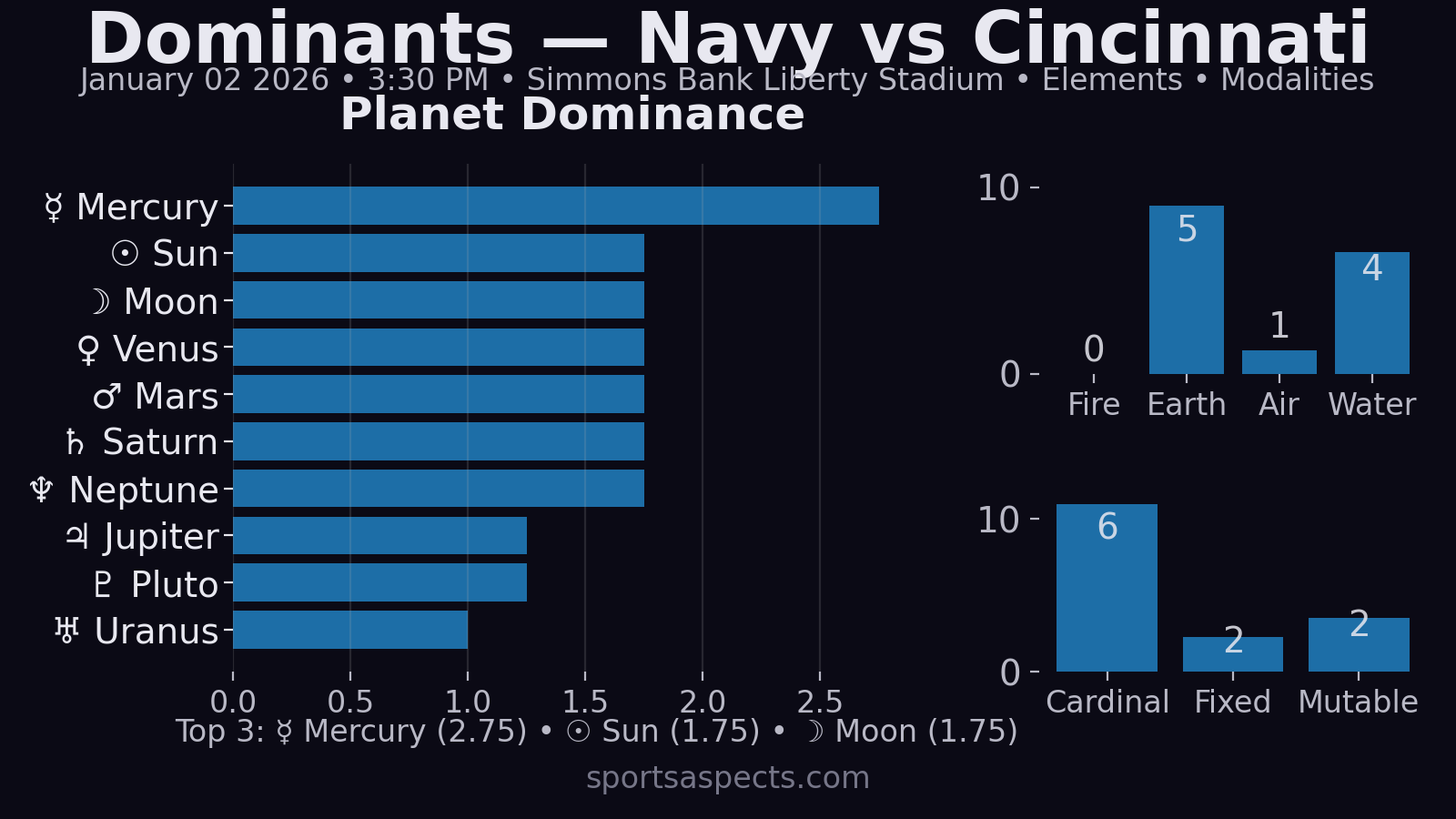 Navy is the betting favorite (-7.5 / ML -278), and the chart looks like a “favorite gets pushed” game: the Moon is strong in Cancer in the 1st (helps the side we assign to ASC), but the 7th house is stacked (Sun–Venus–Mars in Capricorn) and throws repeated oppositions back at the 1st. Translation: Navy can control stretches, yet Cincinnati has real “bite” to keep it tense and force adjustments.