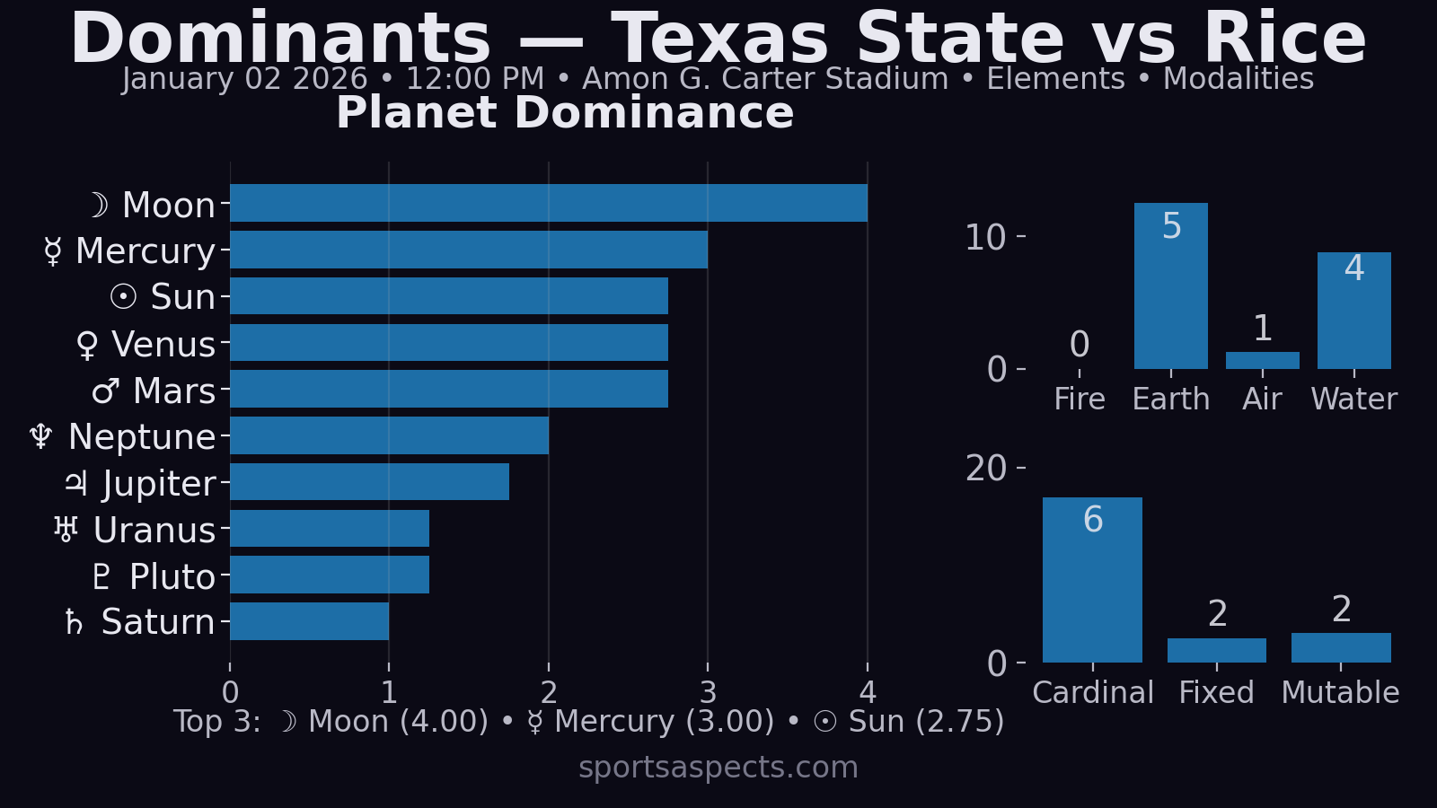 Lean: Texas State to win; Rice has real cover/upset-spice signatures, especially if the favorite gifts points or suffers a sudden Uranus swing. If you want one clean actionable angle from the chart: Rice +19.5 is “astrologically live,” while the ML upset is “possible but needs a big moment.”