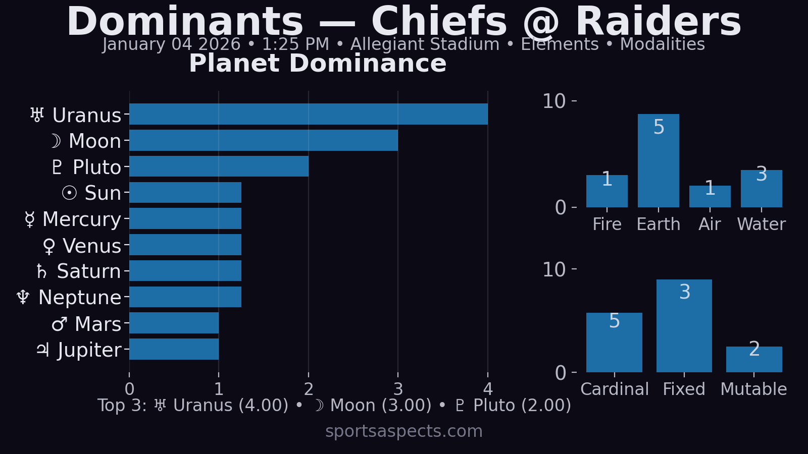 - Raiders upset path is absolutely live because Uranus is basically conjunct the ASC and the Moon is near the IC — that’s the recipe for a sudden swing game. If it happens, it’ll look like: short field(s), one busted coverage, and a momentum cascade.