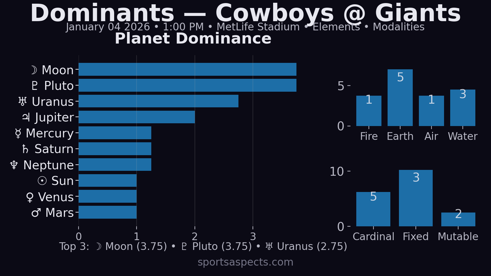 If this stays a disciplined Capricorn grind, Dallas has the cleaner claim: Mars exalted and plugged into the chart’s dominant stellium. The Giants can absolutely make it ugly (Uranus 1st + Leo Moon pride), but their path looks like: force chaos early, ride emotion, steal a turnover, and hope the Mercury–Neptune fog hits Dallas at the worst time.