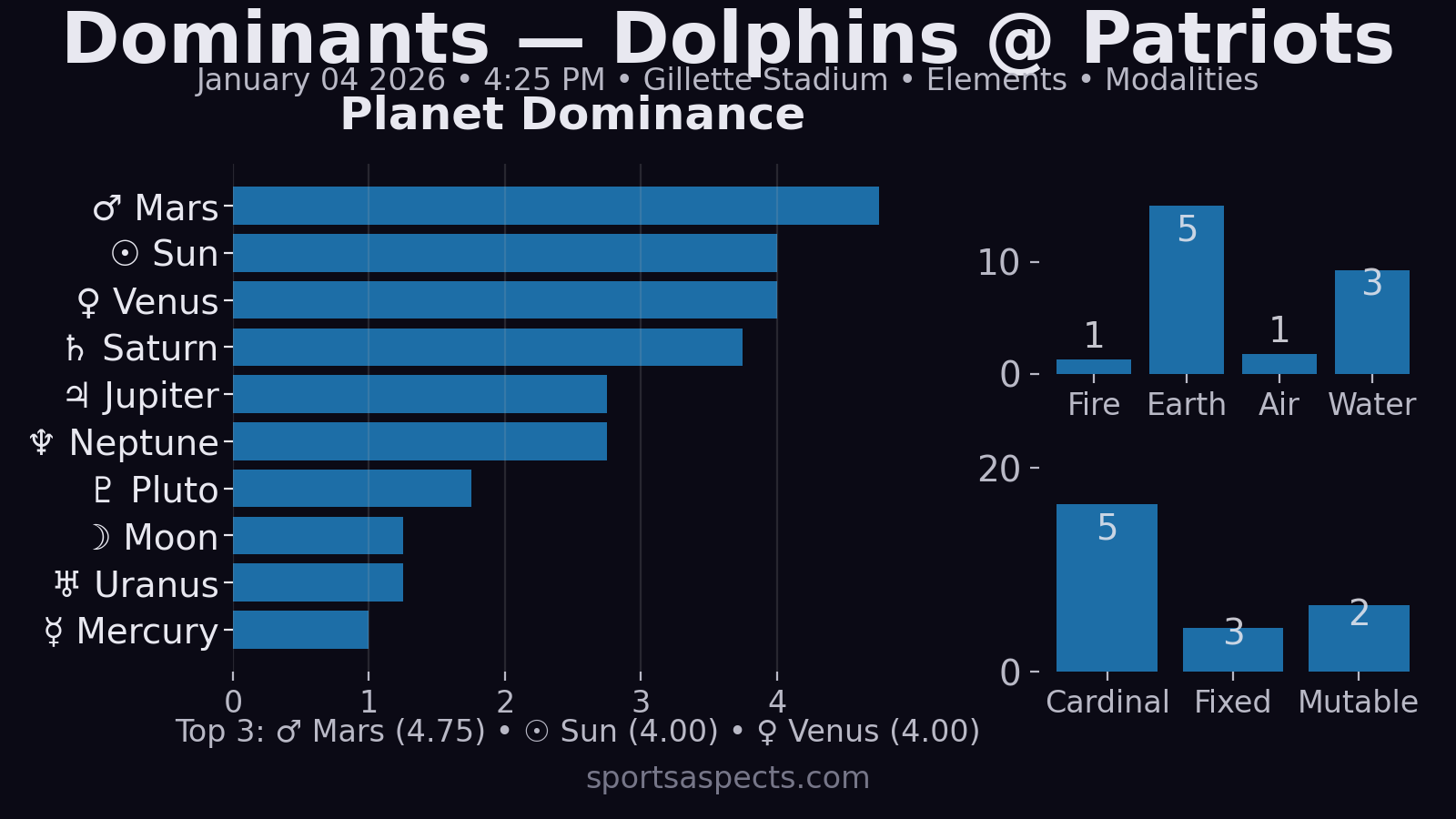 - 6th-house Capricorn stack near the DSC: the opponent’s “work rate” shows up. Miami’s best path is ugly: pressure, ball control, dragging New England into execution errors. If the Dolphins hang around early, it’s through grind + field position rather than finesse.
