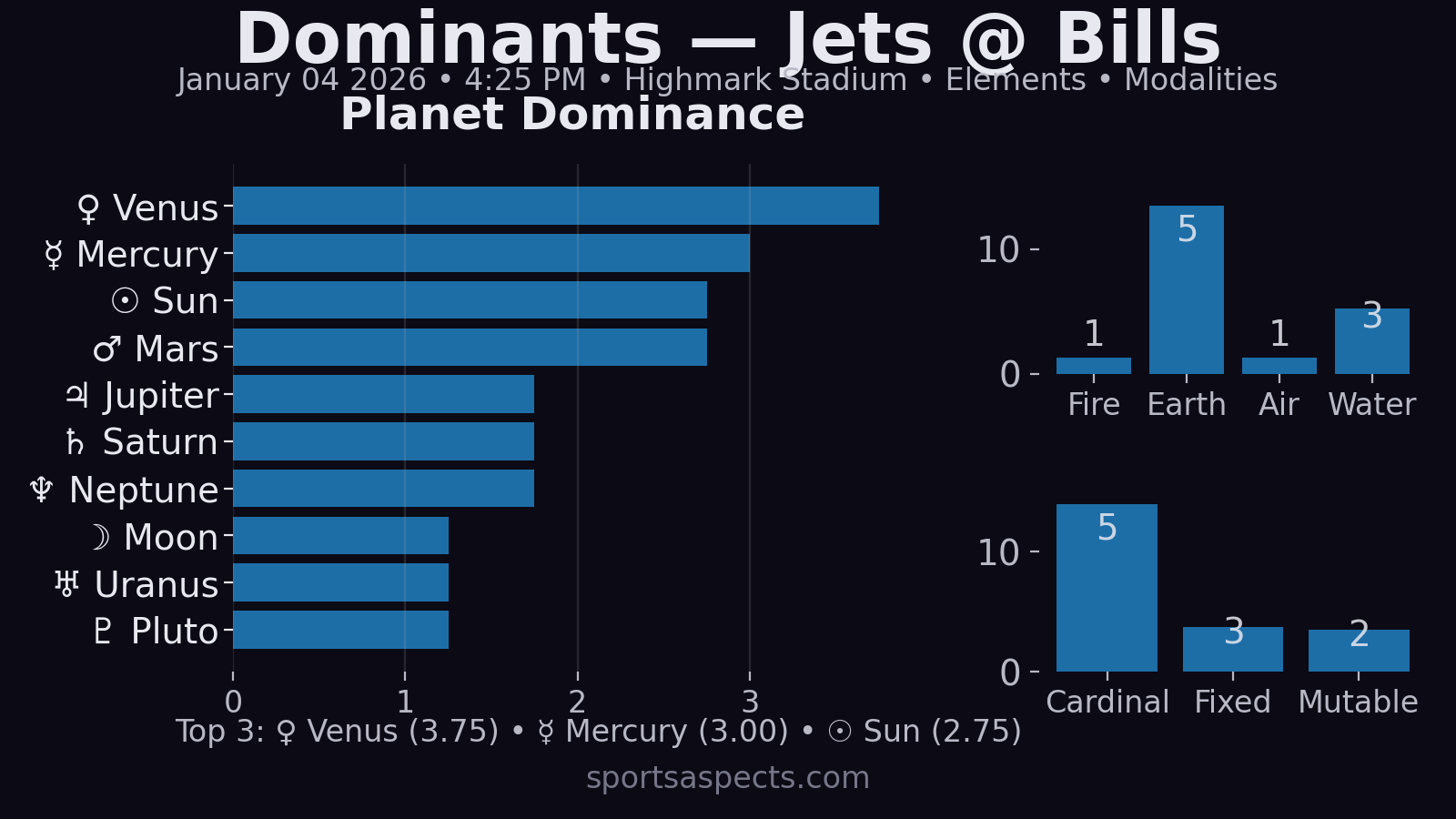 Buffalo’s chart is loud on the relationship axis: a Capricorn pile-up sitting right on/near the Descendant screams “the opponent matters” — either the Jets land an early punch, or Buffalo’s night turns into a constant response game (answering drives, answering momentum, answering weirdness). At the same time, Cancer rising with Jupiter Rx in the 1st gives the Bills a big “home-field buoyancy” signature: even when things get messy, the chart tilts toward Buffalo finding a way to steady the ship.