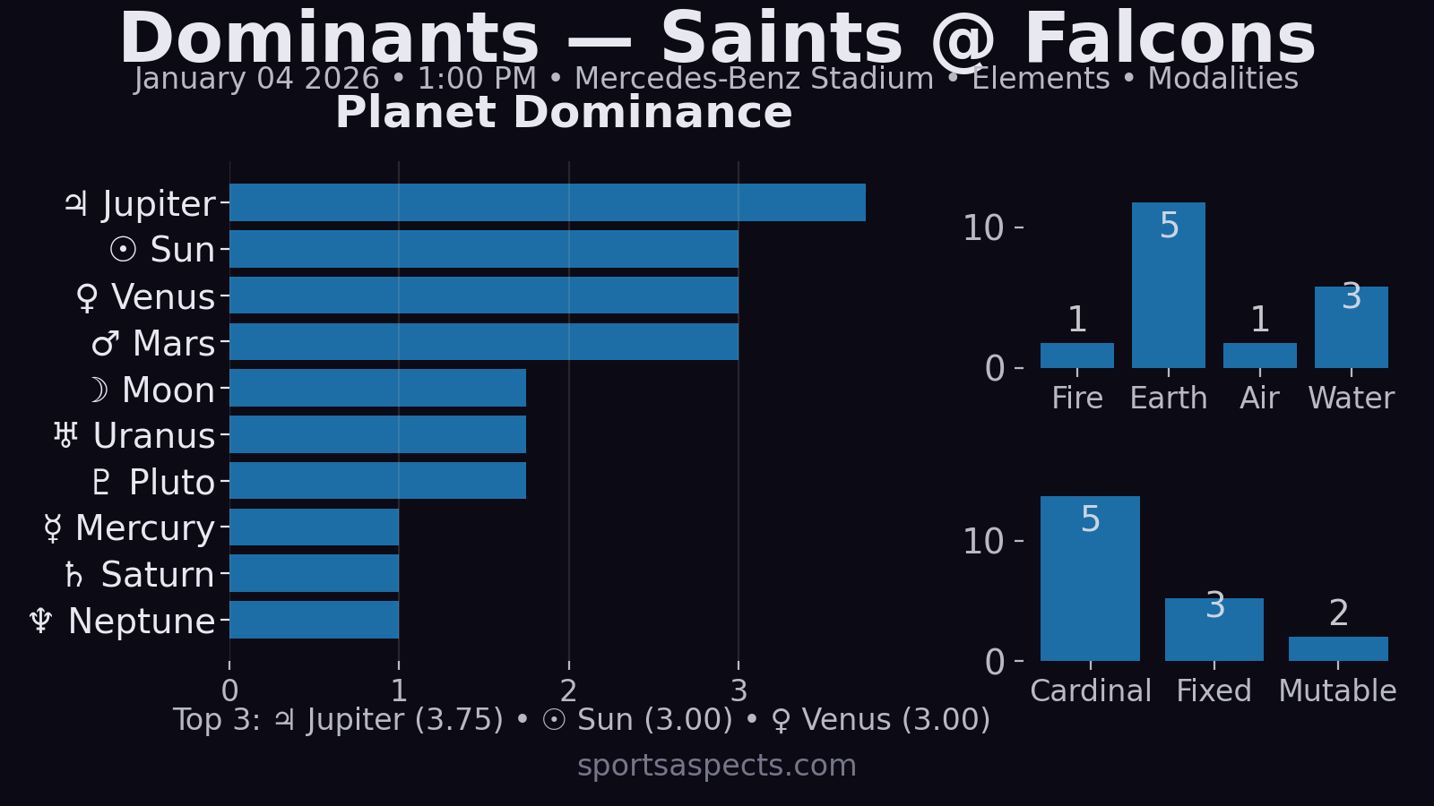 - Jupiter ~2°26 from the IC (Cancer IC 18°25; Jupiter 20°51) = home/venue power spike, but it’s retrograde and under opposition: big emotion + big swings, not clean dominance.