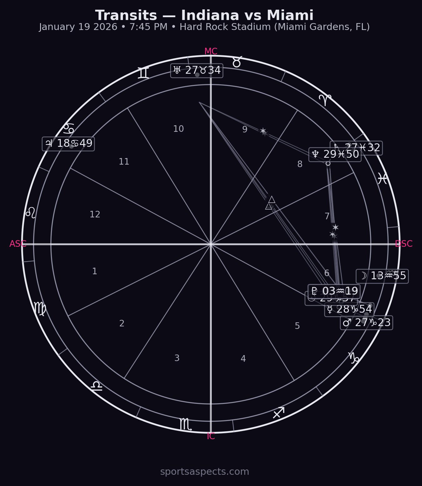 This chart screams high-stakes, “end-of-era / new-era” energy: a late-degree Capricorn pile-up (Sun 29°) feeding into early Aquarius (Venus/Pluto), with Uranus riding close to the MC. Expect a game where discipline and execution matter, but where one or two sudden, momentum-flipping moments can rewrite the script fast—especially off adjustments, special teams, or a single busted assignment.