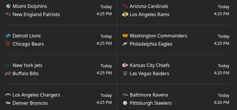 (Other 1:00 games like Browns/Bengals, Cowboys/Giants, Packers/Vikings are basically not playoff drivers — see “rest news” below for why Packers/Vikings is mostly a health game.)